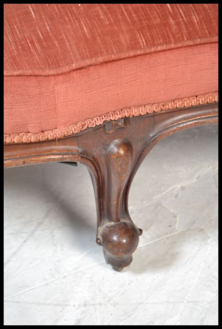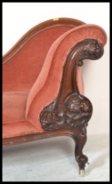 A Victorian 19th century mahogany chaise longue having a scrolled show wood frame with white ceramic castors to the legs, arched back rest, all upholstered in pink velour. Measures: 90cm high x 195cm wide x 70cm deep.