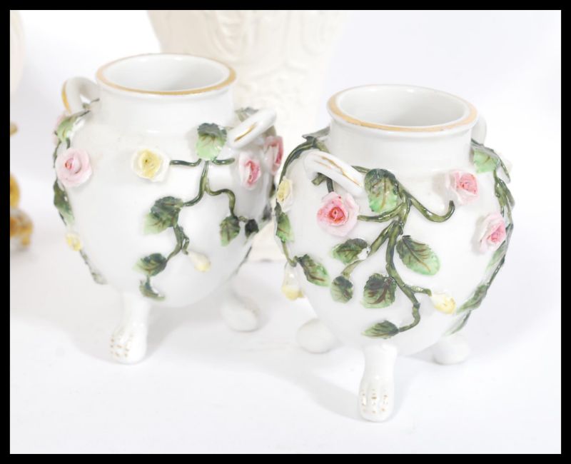 A collection of 19th century porcelain to include a pair of Sitzendorf floral embossed vases of ovoid shape, Blanc de Chine lidded floral pot, a Limoges hand painted bowl raised on gilt scrolled feet and a Victorian footed bowl with cobalt and gilt decoration. Tallest 33cm high.