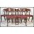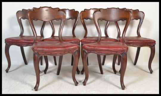A set of six 19th Century Victorian mahogany kidney / balloon back dining chairs raised on cabriole legs with scrolled back rests and faux red leather studded and button seats. Measures: 86cm high x 49cm wide x 44cm deep.