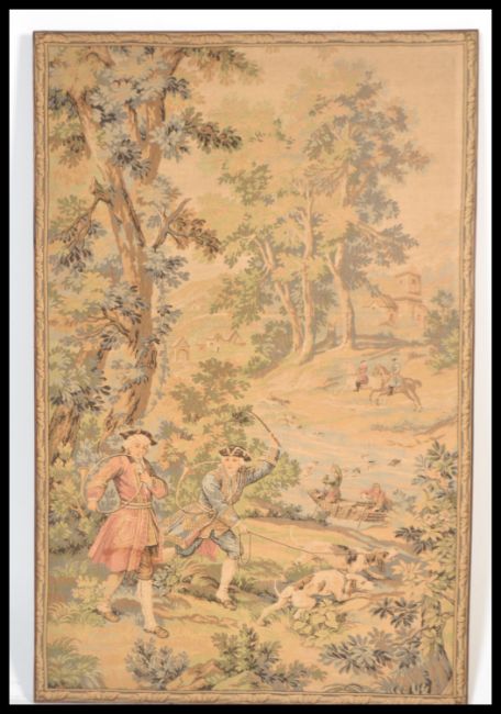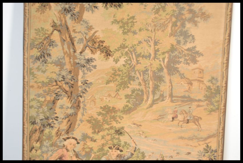 A 19th Century Flemish tapestry wall hanging in the traditional style detailing a mounted hunting party amongst woods with beaters and dogs within a decorative polychrome, floral border. Measures: 147cm high x 96cm wide.