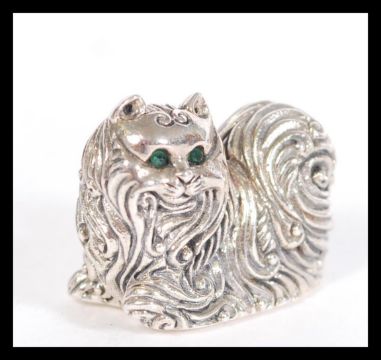 A sterling silver figurine in the form of a cat having emerald set eyes. Weighs 20.5 grams. 2cm high 2.5cm wide.