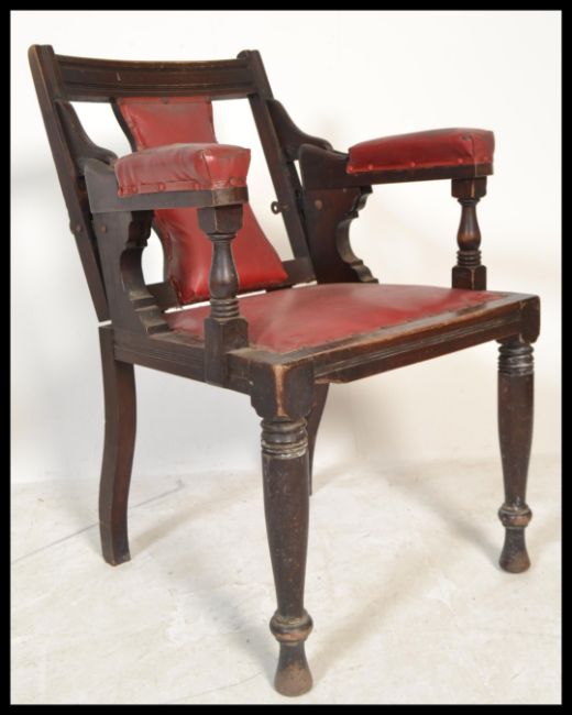 A late 19th / Early 20th Century adjustable Barbers chair, / armchair with red leather upholstered seat and back, studded leather arm rests raised on turned front supports. Measures: 94cm high x 60cm wide x 50cm deep.