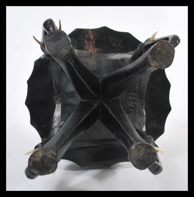 A vintage early 20th century African ebony ashtray raised on a carved elephant base with African tribal figure tops. 46cm high.