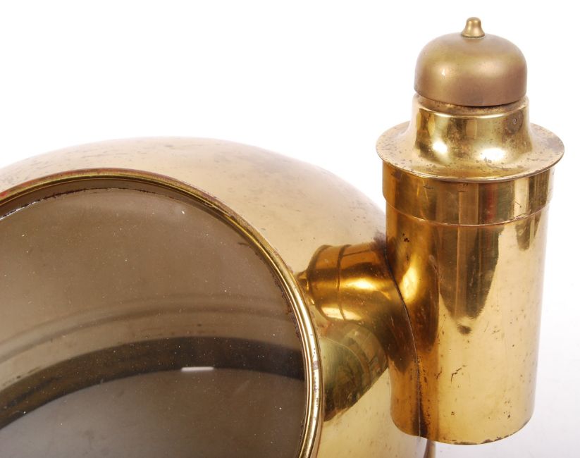A mid 20th century brass binnacle of domed form with a circular observation window and a cylindrical lamp holder / oil burner to the side having a twist release lid. By repute removed from the ' Harry Brown ' sand dredger ship - operating for Holms Sand & Gravel Co in Bristol. Measures approx 33cm tall.