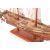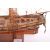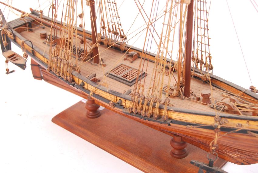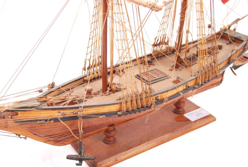 A vintage model wooden tall ship ' Ouragan ' set to a plinth base, the ship having tall masts, tied sails, showing a French flag, anchor, cannons and lifeboats. Measures; 42cm tall.