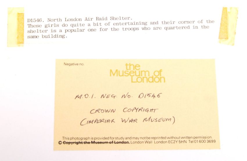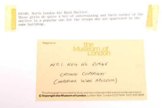 A fascinating collection of some 30+ assorted WWII Second World War interest press / exhibition photographs, appearing to be from the Museum Of London ' The Blitz: Life In The Shelters ' exhibition. Various sizes, but largely 8x10" and 6.5"x 8.5". Most with copyright and description info to verso. Some interesting scenes of central London during the Blitz and scenes of families sheltering in tube stations and similar such images. A truly fascinating set of images. No copyright is implied or sold with these photographs.