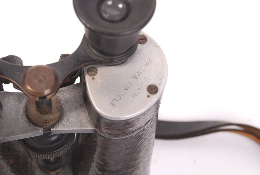 A pair of vintage Busch made ' Terlux ' binoculars. MOD ( Ministry Of Defence ) issue, with stamp to top, and leather grips. Optics in good working order.