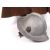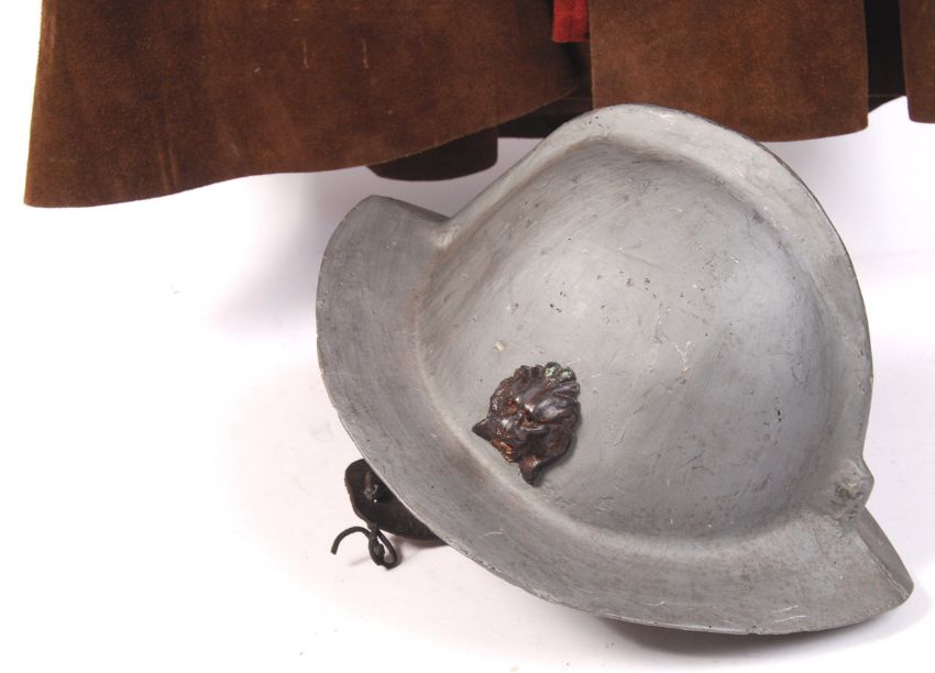 An English Civil War style reenactment soldiers uniform comprising of a lion masked helmet, woollen beige trousers, red woollen shirt, leather waistcoat vest and a leather strap sword belt.