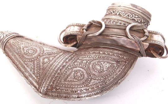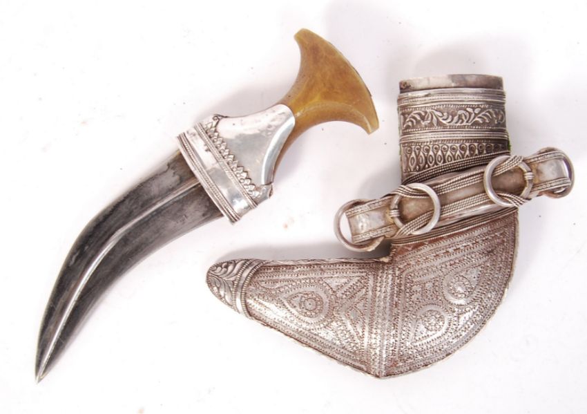 An antique South Arabian Khanjar Omani dagger and scabbard having a silver white metal decorated handle fixed to horn and a curved ridged wide blade with a heavily ornate white metal thread design and repousse decorated scabbard with felt backing. Measures; 30cm overall. Tests as silver.