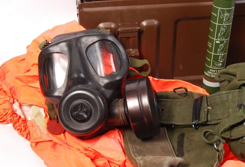 A collection of assorted militaria to include; 2 x 1955 25PR MK2/1 inert brass artillery shells, small ammunition box, partial machine gun belt with spent ammo, webbing, hazmat suit, rubber gas mask, missile box and a hand activated parachute.