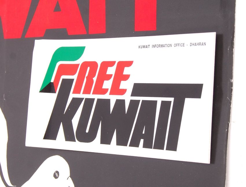 A set of 4x original 1990's Gulf War interest Kuwait propaganda posters - issued by the Kuwait Information Office. Comprising: ' Kuwait - Bloody But Unbowed ', ' Kuwait - Small But Not Alone ', ' Deadline 15th January 1991 - SADDAM ' and ' Liberate Kuwait - NOW! '. Along with an unused ' Free Kuwait ' sticker. Posters measures approx; 68cm x 49cm.