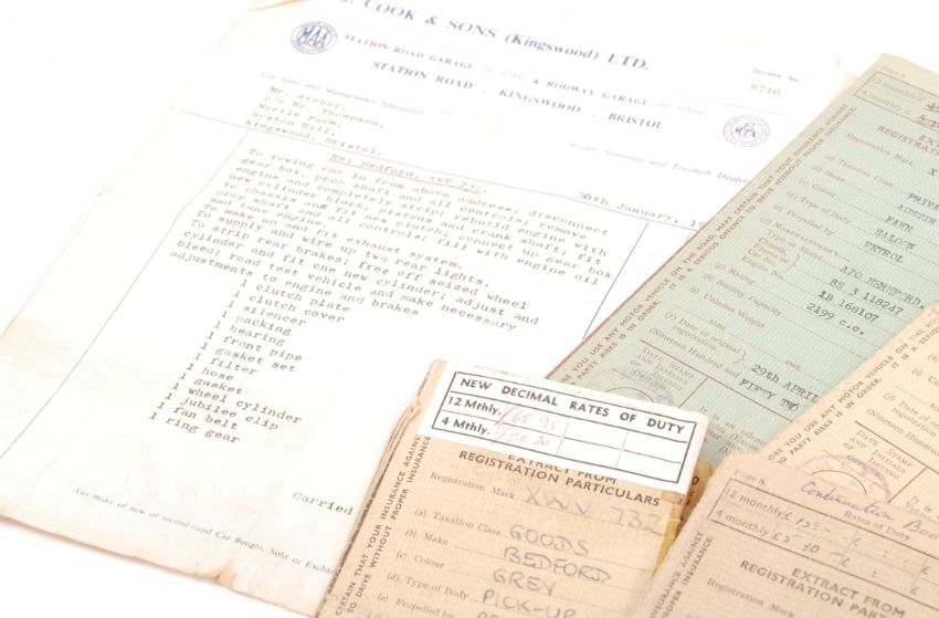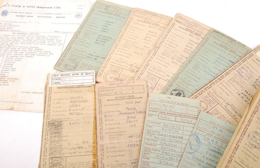 A collection of assorted 1940's to 1950's Vehicle Registration Books largely owned by a Bristol gentlemen residing in St George to include; Austin A70 Hereford Petrol, Ford Pilot Petrol, Austin Omintruck Pick-Up, Hillman Minx Ice, Buick Saloon Petrol, Bedford Pick-Up Petrol with S.J.Cook & Sons LTD garage invoice, Armstrong Siddeley Saloon Ice, Austin A110 Westminster Petrol, Ford Thames Petrol and Vauxhall Velox Petrol.