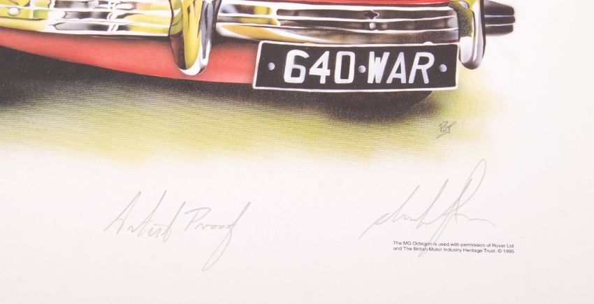 A pair of MG car related limited edition ' Artist Proof ' prints. Each depicting an MG. Each with official MG Blindstamps present, and pencilled with ' Artist Proof ' and signed. Each measures approx; 41cm x 64cm. Unframed.