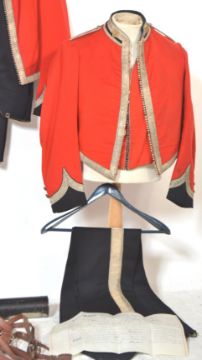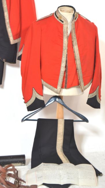 An incredible collection of antique 19th century Victorian uniforms, all belonging to a Lieutenant in the Hungerford Corps of Yeomanry Cavalry in Berkshire ( Berkshire Yeomanry ). Belonging to a Cornet and later Lieutenant Henry Edward Astley. The collection comprising of: the original letter of commission from The Right Honorable Montagu Earl Of Abingdon promoting Astley to Lieutenant (dated 5th April 1861), 3 dress jackets, 2 waistcoats, 3 trousers, various spurs and harness', leather belts, belt with embossed wallet and dispatch bag, hat, and the original hat plume in a metal case marked for ' Captain Seymour - Royal Berks Yeomanry Cavalry '. Consigned direct from family. An incredibly rare and interesting collection of early British Military uniforms. The Berkshire Yeomanry has a long history of association with the town of Hungerford. A Hungerford Troop was first established in 1794 and for much of the nineteenth century the regiment was headquartered in Hungerford. Indeed for some years in the 1830s and 1840s the regiment was styled the Hungerford Troop of Berkshire Yeomanry Cavalry. To this day the Berkshire Yeomanry officers still wear the Hungerford Star and Crescent as insignia. The Berkshire Yeomanry is the County of Berkshire's senior volunteer unit, with over 200 years of voluntary military service. It was originally formed as a mounted cavalry unit, in 1794, and although most was disbanded in 1827, four troops, most notably the Hungerford troop, were reformed in 1830 following the Agricultural Riots of 1830. Only the Hungerford troop remained after further cuts in 1838. In 1852 there were further expansions, with the Regiment renamed 'The Royal Berkshire Yeomanry Cavalry'. They went on to serve in the Boer War, and both World Wars. The regiment has seen service as machine gunners, artillery, armour, infantry, and now signals, serving with the Royal Corps of Signals. In 1969 they became part of the Territorial Army (Signals), and has bases at Ayelsbury and Windsor, where there is the Regimental Museum.One member of what was to become a very prominent family in Hungerford, became commissioned into the Royal Berkshire Yeomanry. Henry Edward Astley, (born 1817, the 8th child of Rev. Wolvey Astley, Rector of Quenington, Gloucestershire) came to Hungerford in 1847 at the age of 30 years. He was a solicitor, and joined John Matthews, whose practice had been at Bridge House (now 132 High Street) since he bought it in 1826. In 1853 Henry Edward Astley was commissioned into the Hungerford branch of Royal Berkshire Yeomanry as a cornet. He was promoted Lieutenant in 1861, aged 44 years. [Cornet was originally the third and lowest grade of commissioned officer in a British cavalry troop, after captain and lieutenant. The cornet by tradition carried the troop standard, which was also known as a "cornet". The rank of Cornet was the equivalent of the infantry rank of ensign, and was one of the subaltern ranks (along with lieutenant). The rank had been in use by the time of the English Civil War, but was abolished in 1871, at the same time that the purchase of commissions in the army was abolished in the Army Reform Act of 1871 and was replaced by Second Lieutenant. In practice, the style "Cornet" is still used for Second Lieutenants in the Blues and Royals and the Queen's Royal Hussars.]Two years later, in 1863 Henry Edward Astley, aged 46, resigned from the Yeomanry, and married a near neighbour, a widow, Mrs Benjamin Keen (who already had two daughters of her own), of Faringdon House, 128 High Street. Henry and his new wife had only one child, Henry d'Oyley Astley, born 1865, who went on to follow his father's profession as a solicitor in the town. His daughter, Barbara Astley married Mr W.K.T. Hope from Wellingborough. Henry Edward Astley died 1886.(information from www.hungerfordvirtualmuseum.co.uk)