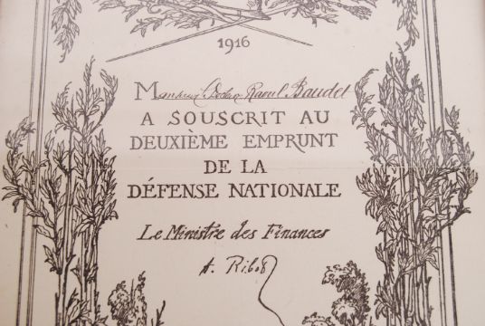 A WWI First World War French Soldier's medal group. Awarded to a Monsieur Raoul Baudet. Comprising: his ' Pour La Victoire ' 1916 certificate, his Croix De Guerre War Medal, another Croix De Guerre (with bronze palm - for a mention is dispatches), and his Medaille Militaire ( Military Medal ). All neatly framed in a glass presentation frame.