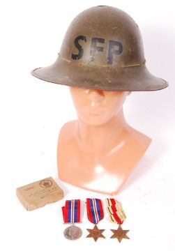 A WWII Second World War Bristol local interest medal group and helmet. Belonging to a Mr E. R. Tyler of Lawrence Weston. Comprising: War Medal, 1939-45 Star, and Africa Star. Within their original issue box. Along with a related SFP ( Supplementary Fire Party ) helmet, believed to be that of Tylers. Interesting collection.