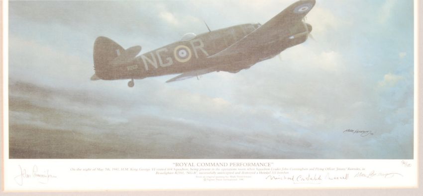 A collection of 4x assorted military aeroplane aircraft aeronautical prints to include; ' Duel Of Eagles ' after Robert Taylor signed by Douglas Bader and Adolf Galland, 'Royal Command Performance' 1990 by Mark Postlethwaite and signed by himself and others, ' Eternal Grace ' limited edition signed print after Peter Greenhill and ' Gathering Grace ' limited edition print after Maurice Gardiner. Largest measures; 65cm x 68cm.