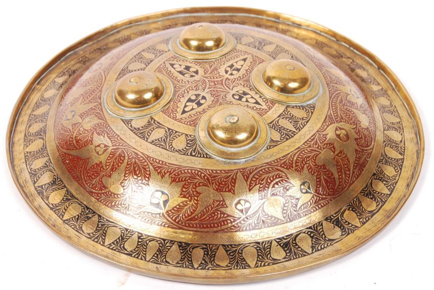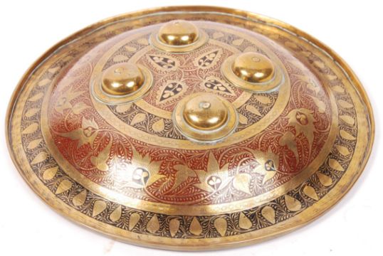 A 20th century Afghan / Indo-Persian brass chased Dhal / Sipar / Buckler shield . The shield having 4 x domed medallions and chased and enamelled leaf detailing, each dome being attached through the reverse with sturdy metal pins having loops to create the handles. Measures; 27cm diameter.
