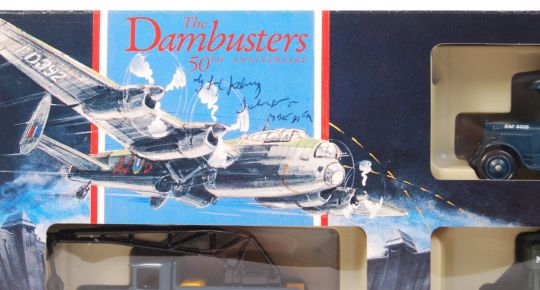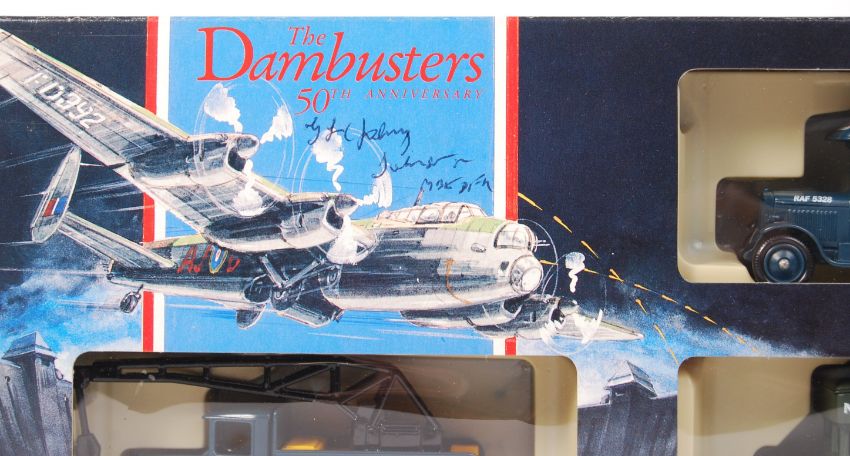 An official Special Edition ' Dambusters 50th Anniversary ' WWII Second World War ' commemorative presentation diecast model set by Lledo. Featuring 3x WWII vehicles, released to commemorate the 50th anniversary of the Dambusters raid. Signed exclusively for this auction by last surviving Dambuster George Johnny Johnson on both the box and interior vehicles. Rare.