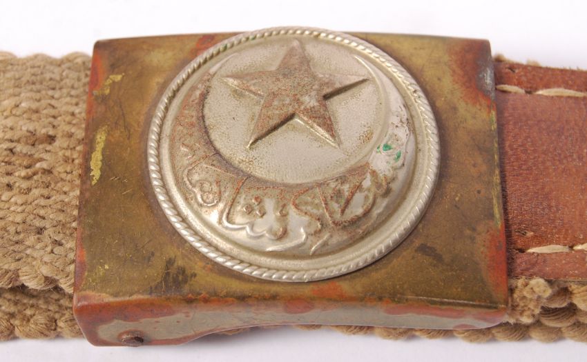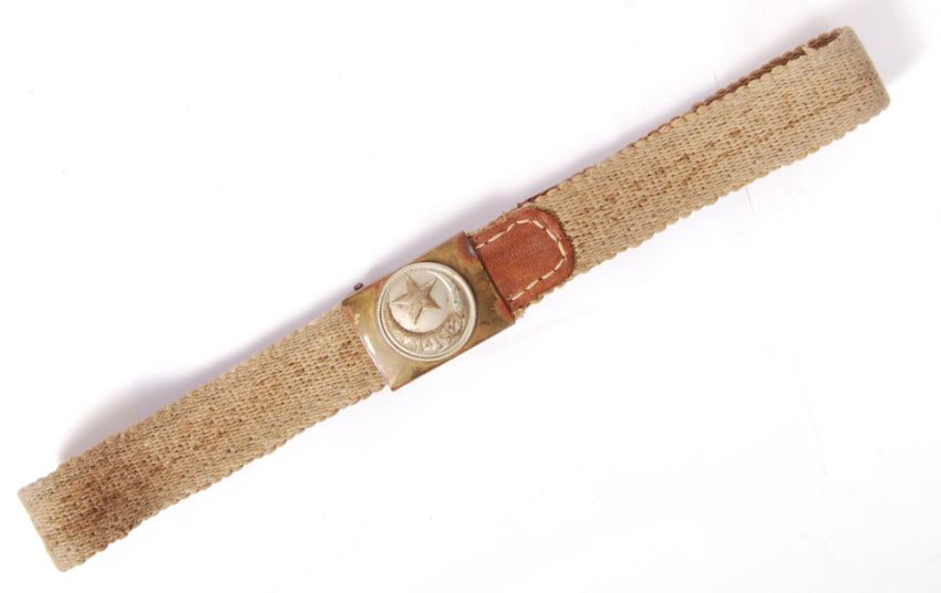 A rare original WWI First World War period Turkish Ottoman Army military uniform belt. Comprising of a brass and nickel buckle with Turkish emblem, and it's original canvas and leather belt. From the Searle family collection.