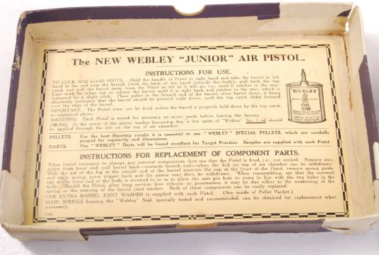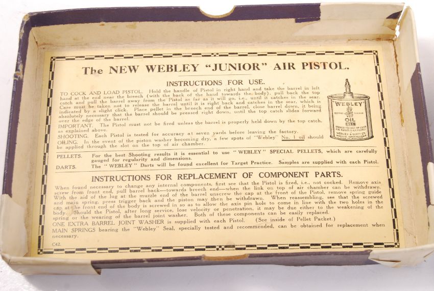 A rare vintage Webley Junior Air Pistol. .177 calibre, and present within it's original bi-tone printed box. Instructions and inner card still present. Serial No. J13424. Full working order.