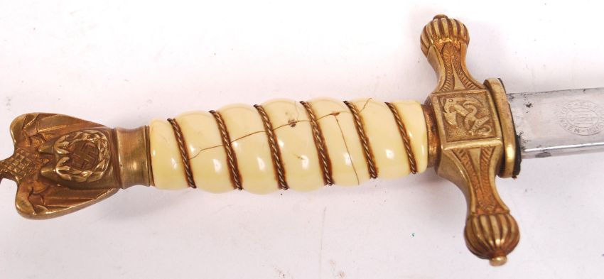 A WWII Second World War German Kriegsmarine Navy dagger. With engraved blade, gilded brass scabbard and mounts. With eagle pommel perched on anchor and wreath to hilt. Ricasso marked for F. Horster of Solingen. AF - some pitting to blade, and celluloid handle with crack. Rare. Approx 42cm long.