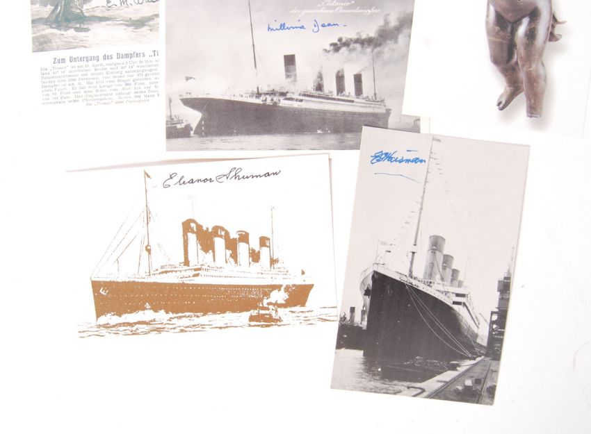 A collection of 6x autographed Titanic related postcards - each signed by various Titanic survivors. To include the signatures of: Betty Walker (reputedly conceived aboard Titanic), Millvina Dean (x3), Edith Haisman and Eleanor Schuman. Interesting collection of autographs. RMS Titanic was a British passenger liner that sank in the North Atlantic Ocean in the early hours of 15 April 1912, after colliding with an iceberg during her maiden voyage from Southampton to New York City. There were an estimated 2,224 passengers and crew aboard, and more than 1,500 died, making it one of the deadliest commercial peacetime maritime disasters in modern history. RMS Titanic was the largest ship afloat at the time she entered service and was the second of three Olympic-class ocean liners operated by the White Star Line. She was built by the Harland and Wolff shipyard in Belfast. Thomas Andrews, her architect, died in the disaster.