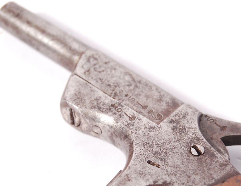 An unusual antique 19th century 5.5mm barrel pinfire pocket pistol revolver having wooden grips and brass rivet. Bearing Belgium proof marks to the side of the barrel, body and hammer.