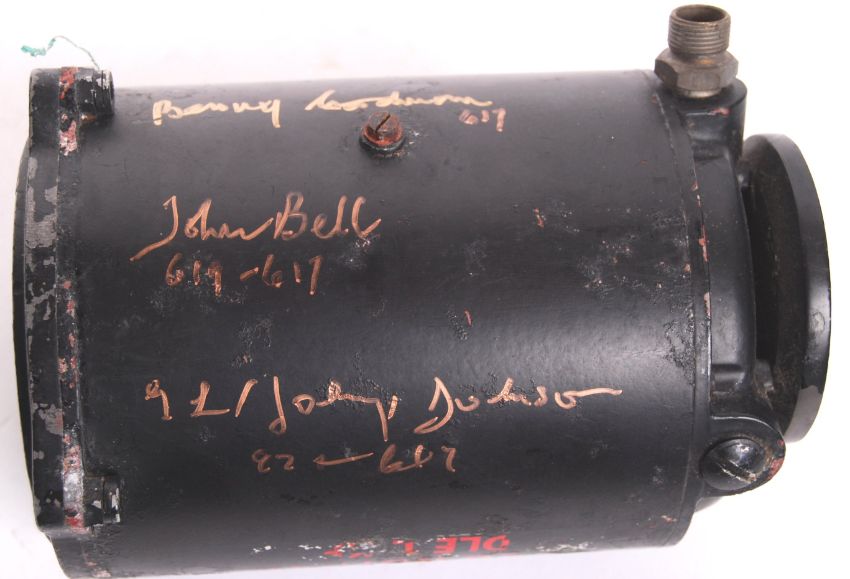 A rare original WWII Second World War era Lancaster Bomber cockpit ' Artificial Horizon ' gauge. Various Air Ministry markings to the casing, with warning ' Do Not Jar - Handle Like Eggs ' to side. Autographed to the casing by 617 Squadron Veterans John Bell ( Bomb Aimer ), George Johnny Johnson ( Dambuster Bomb Aimer ) and Benny Goodman ( Pilot ). Rare.
