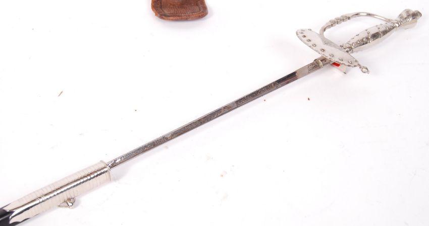 An early 20th century steel court sword with scabbard and leather case, the sword having a triangular and etched blade and decorated guarded handle with a black leather and metal adorned scabbard. Measures; 98cm.