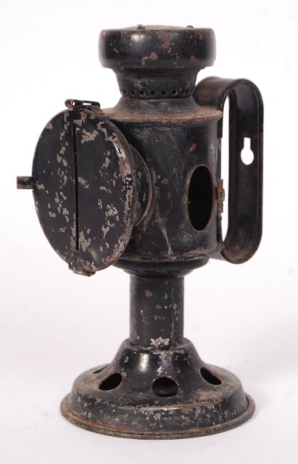 A rare WWII Second World War military issue blackout lamp / lantern. Makers marks to side for Bladon & Son Ltd. 1941 pattern. Complete with blackout cover panel and handle to rear. Military broad arrow marks present. Measures approx; 20cm tall.