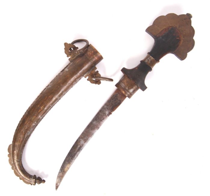 An early 20th century Middle Eastern Jambiy a dagger having a wooden carved, brass adorned and gem handled curved edge bladed dagger with heavily decorated and chased brass scabbard with two large hooking rings. Measures; 46cm.