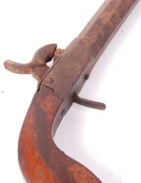 An antique 19th century small percussion cap pistol. Obsolete calibre. Octagonal barrel, with illegible proof marks. Signs of engraving to the lock. Mechanism partially working, but requires attention. Measures approx; 22cm long