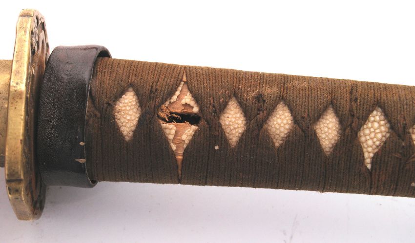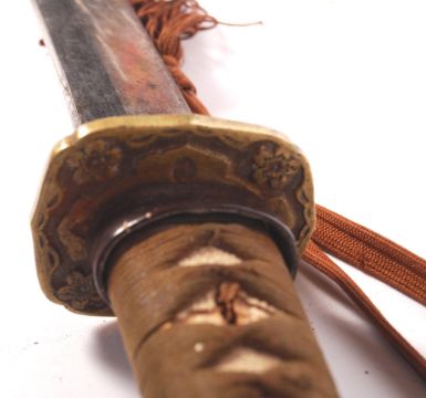 A rare antique Japanese Military Officer's Showa Katana Sword. Curved toshin blade, with brass tsuba and habaki, with a sharkskin bound handle and military officer's combat tassle. Tang unmarked. Within it's original leather covered wooden scabbard. Slight AF - small 1.5cm of edge wear to blade, pin missing to hilt). Measures approx; 93cm long. Rare.