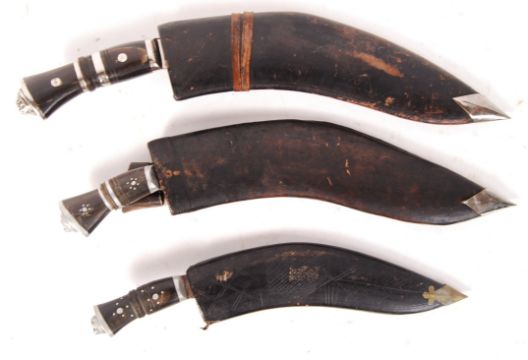A collection of 3x early to mid 20th century Middle Eastern Kukri knives with lion mask pommels of graduating sizes all within their original scabbards. The medium sized one having all of it's smaller knives within the scabbard. Largest measures; approximately 28cm