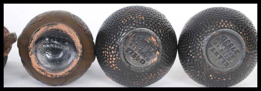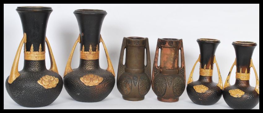 A collection of Bretby 19th / early 20th Century Clanta pattern ceramics having a bronze effect glaze to include a pair of Arts and Crafts hammered effect vases no. 2730F along with a matching smaller pair 2730D and pair of bronzed twin handled spill vases no. 2406D. Tallest measures 25cm high.