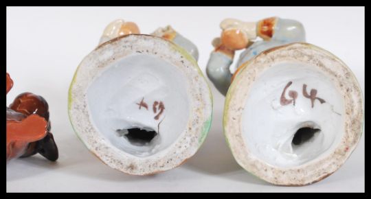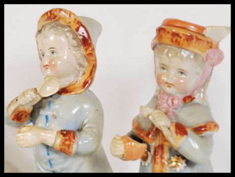 A pair of 19th Century Austrian ceramics modelled as a young boy and girl, together with a pair of ceramic babies crawling etc. Tallest 21cm high.