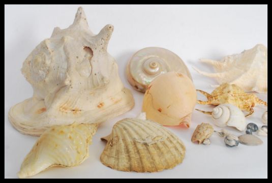 Conchology - A collection of sea shells of various forms and sizes to include Conch, Nautilus type and cone type shells.  Biggest measures 22cm high x 29cm wide.