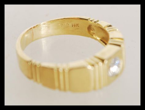 An 18ct gold diamond band ring having an inset diamond of approx 25pts with faceted shoulders. Weighs 5.9 grams size P.