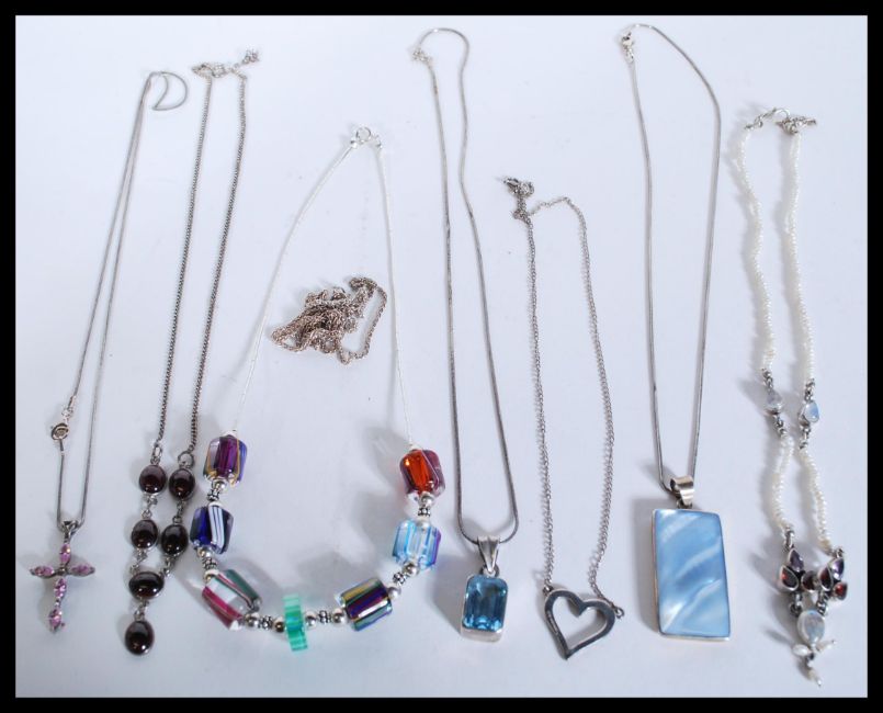A selection of silver necklaces to include a necklace with coloured glass beads, a heart pendant necklace, a mother of pearl pendant necklace, a necklace st with purple stones, a pearl necklace set with yellow stones etc. Total weight 71.9g.