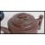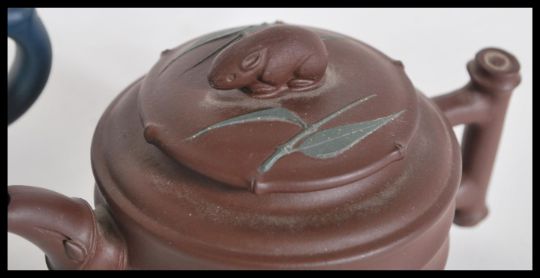 Two Chinese Yixing terracotta teapots comprising of a brown example with ribbed decoration and hare to lid. The other in black having character marks to base. Measures 9 cm high.