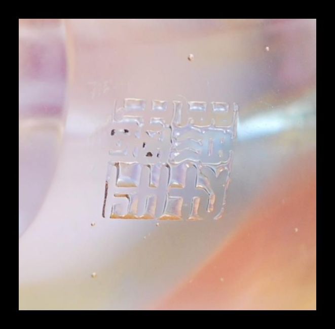 A rare Chinese Liuli crystal figurine group paperweight of two fish on scrolled wave base. Iridescent colouring with four impressed character marks to side. Measures 9cm high 10cm wide.
