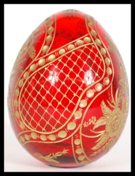 A vintage 20th Century Russian cranberry red glass egg having beautiful hand gilded decoration depicting flowers and ;eaves. Label to base reading Inspired Faberge Russia St Petersburg. 10cm high.