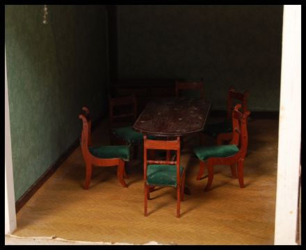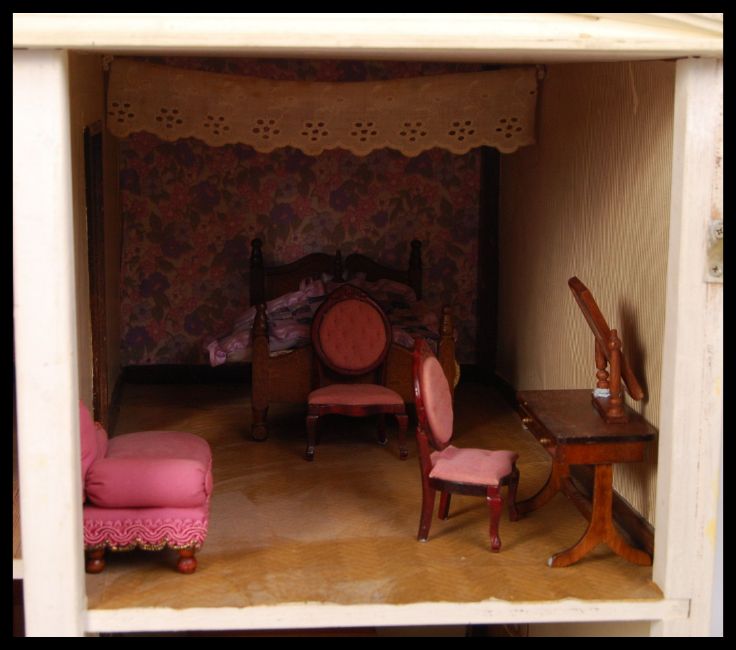 A charming vintage 20th century Georgian style dolls house. Three storey, with tri-fold opening doors to front and hinged attic section. Opens to reveal eight rooms, all come fully furnished with furniture and accessories. Many of the rooms are decorated with carpets and wall paper. A charming example of a contemporary dolls house. Measures approx; H69cm x W72cm x D54cm.