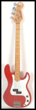 A vintage Marlin electric stratocaster style bass guitar having a red body with chrome tuning pegs. Measures 116cm long