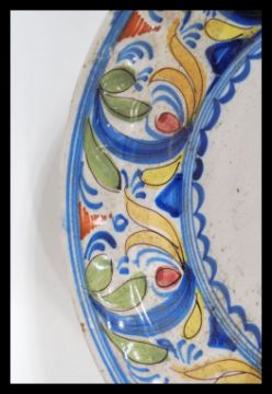 An 18th Century Delft polychrome charger plate depicting a bird to centre with scrolled floral borders and blue painted bands.