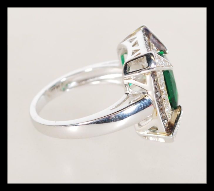 A sterling silver CZ and faux emerald dress ring in the Art Deco style. Weighs 5.4 grams size M.5.