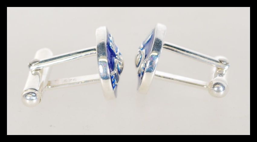A pair of sterling silver and enamel set cufflinks depicting Irish / Claddagh symbols. Weighs 9 grams. Measures 1.5cm wide.