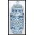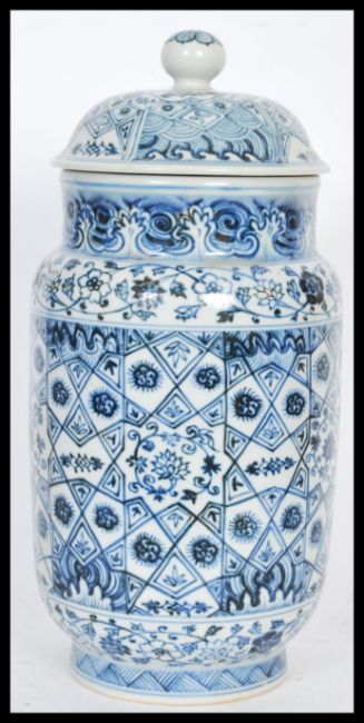 A Chinese hand painted blue and white ceramic vase and cover of cylindrical form having a bell shaped finial lid. Six character blue Huande mark to base but later. Measures 32cm high 15cm diameter.