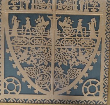 A framed 19th gilt pierced lattice panel ( taken from a marriage cabinet ) having stunning decoration of foliates and birds of paradise having central scenes of lady in cart and man. Framed and glazed. Measures 88cms x 58cms